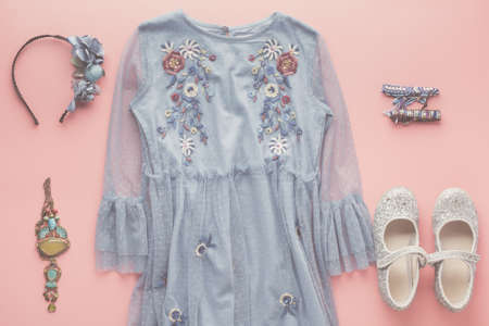 Girls fashion background blue tulle dress with embroidery, sparkly shoes, flower headband, bracelets and necklace on pink, flat lay, top view, toned photo, selective focus