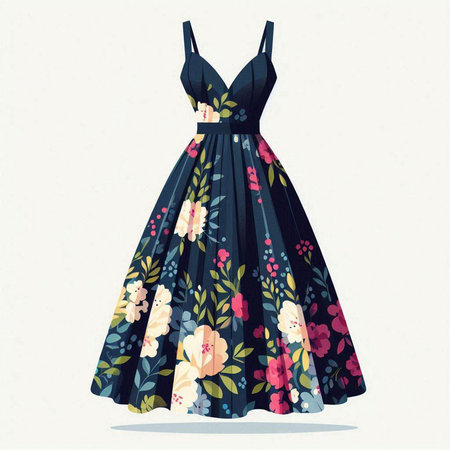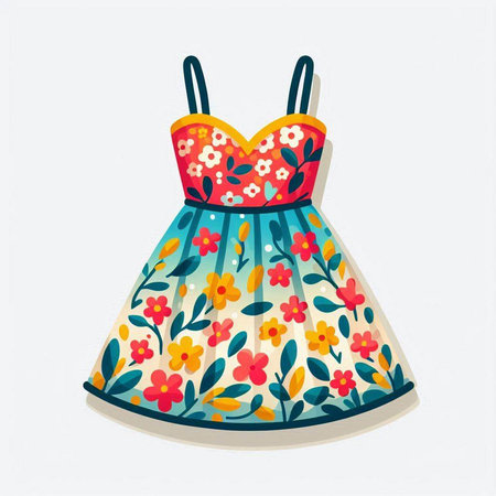 Fashionable summer dress with floral pattern. Hand drawn vector illustration.