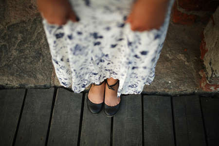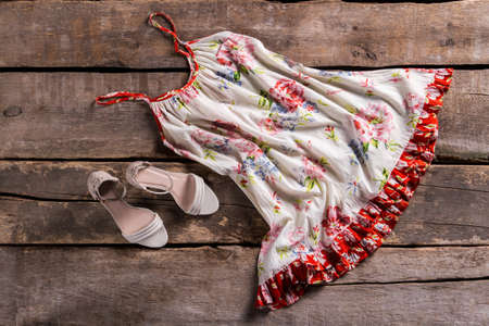 Sarafan with beige heel shoes. Sarafan on aged brown floor. Retro summer clothing sale. Women wore this years ago.