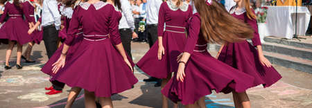elegant high school graduates in the same dresses of marsala dance a waltz in the schoolyard