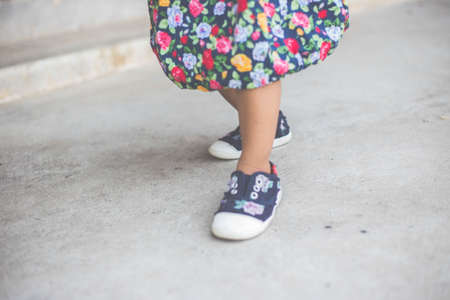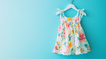 Cute sleeveless baby dress. Cotton vintage colorful baby-girl dress and copy space. Image of casual toddlers beautiful dress.