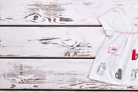 Baby girl cats cartoon dress. Newborn girl short sleeve white dress on white wooden background, copy space.