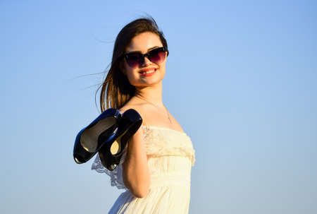 my new shoes. youth beauty. Beautiful young woman brunette hair. summer holiday and vacation. time to relax. free and happy. carefree girl look on sun. Fashion style. being in romantic mood