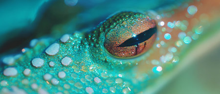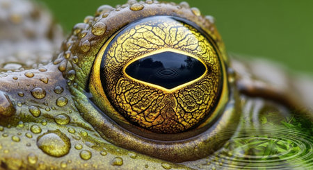 This close-up image showcases a frog's eye, highlighting its detailed texture and the water droplets on its green skin. The macro perspective emphasizes the intricate patterns and colors. This image can be used for various purposes, including educational materials, nature-related projects, and design elements.
