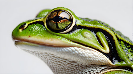 A detailed close-up reveals a frog with textured skin and a vibrant green coloration, accentuated by a yellow stripe. The image emphasizes the amphibian's features in daylight. Suitable for illustrating biodiversity, ecological studies, or educational resources. Can be used for design projects or nature publications.