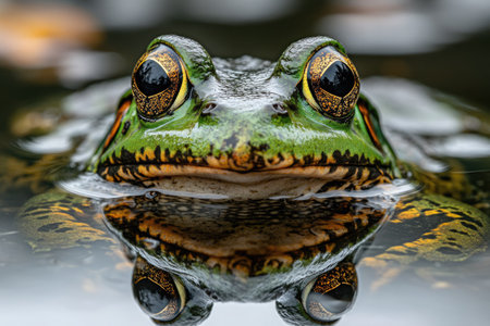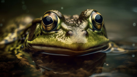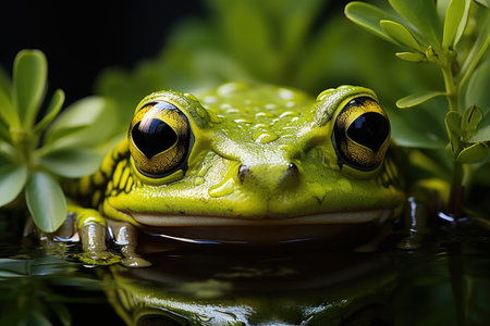 A stunning close-up of a frog partially submerged in calm water, showcasing its captivating eyes and serene reflection amidst lush green leaves, emphasizing the beauty of nature.