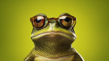An adorable frog strikes a fashionable pose, sporting a trendy pair of sunglasses. Set against a delightful pastel background, this image captures the essence of a laid-back and stylish amphibian.