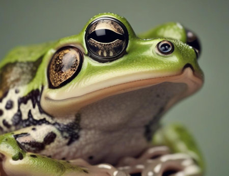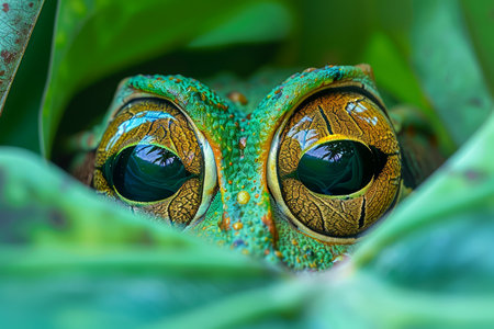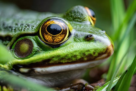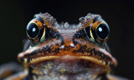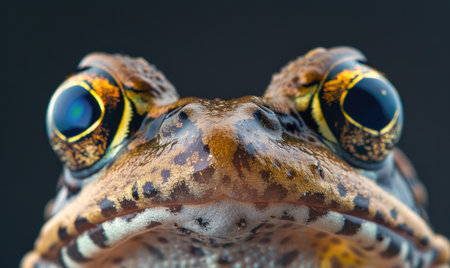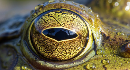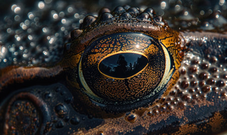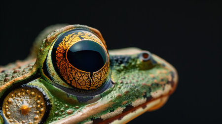 Macro shot of a frog's vibrant eye, revealing intricate patterns and textures with a sharp focus on the captivating golden iris.