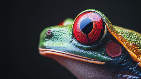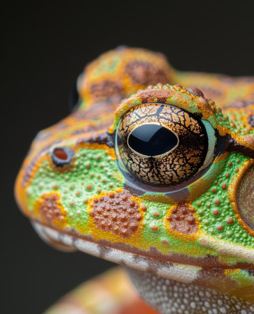 Close-up of a colorful frog with detailed eyes against dark background