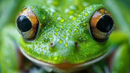 A detailed close-up reveals a frog with textured skin and captivating eyes. Water droplets cling to its surface, highlighting its vibrant green and brown hues. The composition focuses on the frog's head, emphasizing its features against a blurred background, making it suitable for nature-related content and potential commercial applications.