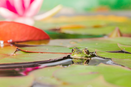 Green frog sitting on a lily leaf in a pond with water lilies