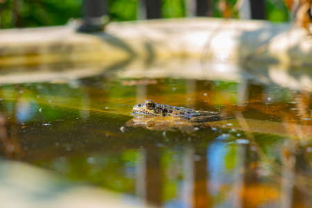 Small frog swimming in the pond in summer. Amphibian reptile.
