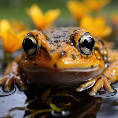 Green toad sitting on leaf, watching water generated by artificial intelligence