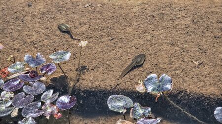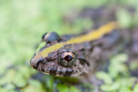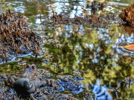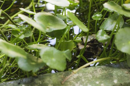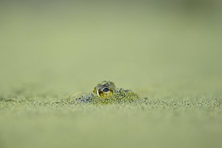tiny frog peeking with eyes above water surface in small pond or puddle