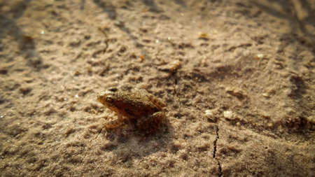 Little Pollywog evolve into Anuran. Edible Frog, Rana esculenta, around 12 weeks old after hatching, on biege sandy backgdrop. Close-up view with space for text on coastal sand