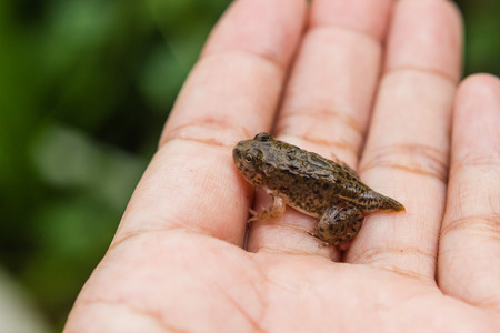 Close-up of small wild frog on foot. Curious child watching and exploring animals in nature.