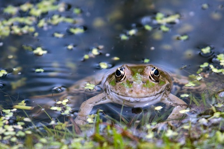 One Frog resting in water. Pool frog sitting. Pelophylax lessonae. European frog.