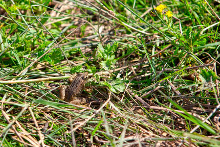 True toad frog on lawn in garden on sunny spring day looking for food. Close up, selective focus. Serbia, Europe
