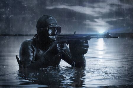 Trained commander of the Marines emerged with a scuba gear and moves to the target with weapons in his hands. The concept of video games, advertising, instability in the world, country conflicts. Mixed media