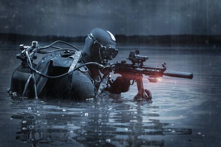 Navy SEAL frogman with complete diving gear and weapons in the water