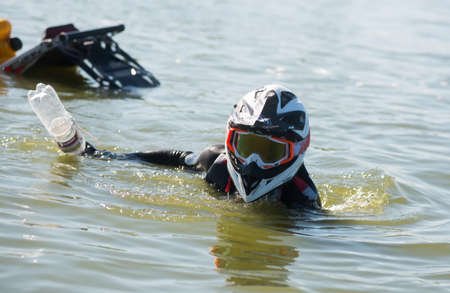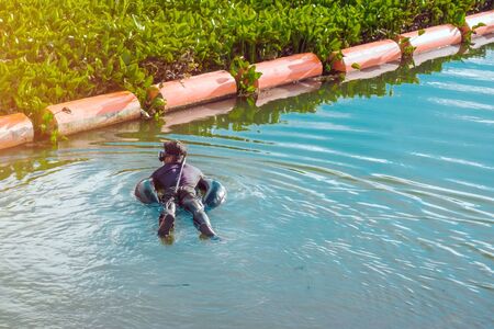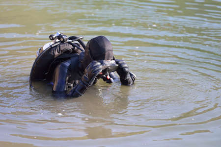 Russia, River Volga Kama - Aug 05th 2020. Commercial offshore diving. Professional diver is ready to start working with assistants. Occupation in the offshore industry