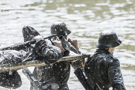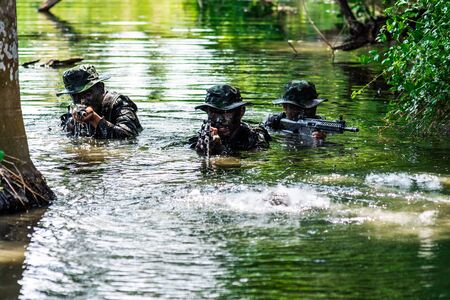 Bangkok Thailand - April 21 , 2018 : Simulation of the battle plan. Three military officers rose up out of the water to attack the enemy. Photo rally by Nikon Club Thailand at 11Th Infantry Regiment.