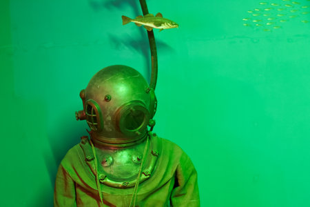 Diver in a classic metal helmet stands still in a large aquarium filled with turquoise water, while a fish swims nearby under soft lighting.