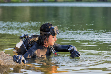 Beautiful caucasian diver woman is preparing to enter the water. Exploring the depths