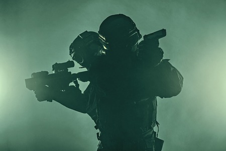 Shallow depth of field (selective focus) details with a special forces soldier aiming his weapon.