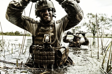 Army special operations forces soldiers, commando fighters doing fist dump gesture while standing knee-deep in water. Two Marines shooters or coast guard fighters celebrating mission successful ending