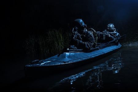 Two special forces soldiers in the military kayak. Diversionary mission under cover of darkness