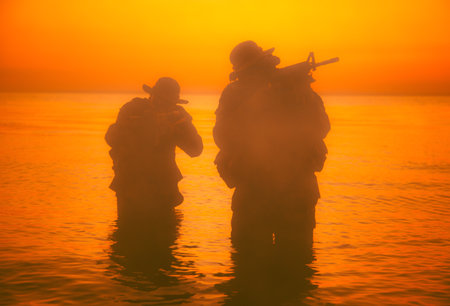 Commando soldiers walking in water, army special operations forces fighters sneaking in darkness, aiming assault rifles and observing shore during amphibious operation on coast at night or dawn