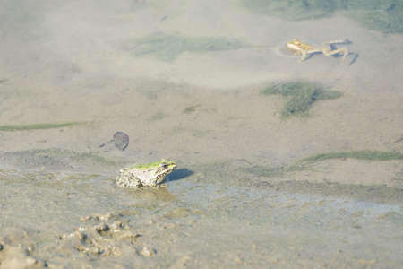 Common frogs pairing in a pond. Couple of frogs are sitting in the river and enjoying sunlight in spring period. Spring in Belarus. Detailed photo of two frogs.