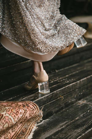 Beige shoes with a transparent heel on the brides legs go along the wooden staircase, evening dress with embroidery. Vertical