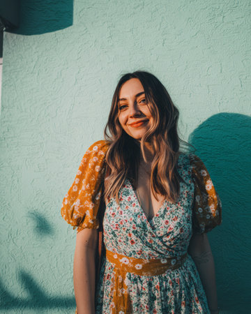 A young woman stands smiling wearing a floral dress with short sleeves. The bright blue wall behind her contrasts with the warm light during late afternoon.