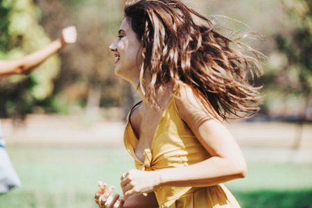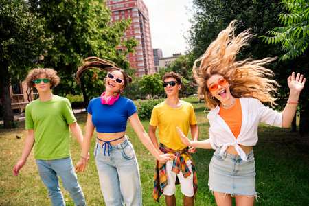 Young people having fun in the park, running in circles, laughing, and creating beautiful friendship memories