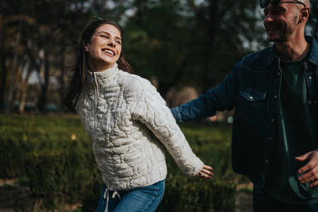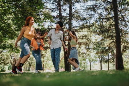 Young friends having fun in the park, running in circles, and creating beautiful friendship memories