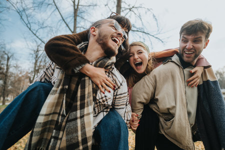 Group of friends enjoying playful moments outdoors in the autumn season