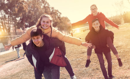 Cheerful teenage boys carrying girlfriends on back