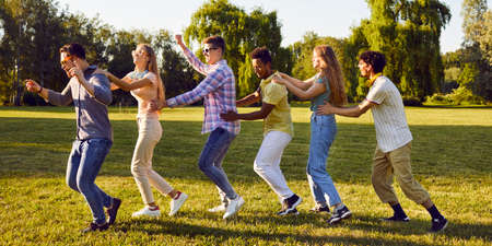 Cheerful active young men and women having fun running in row one after another during gathering in park. Funny multiracial friends have fun together outdoors on summer day. Web banner.