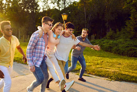 Young people having fun outdoors. Funny best friends having fun walking on sidewalk in public city park on warm summer day. Guys funny carry their female friend who hung on their shoulders.