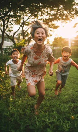 Generative AI : Full length cheerful young mother with little son and daughter holding hands and running together in green field during sunset in summer evening in countryside