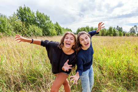 Summer holidays vacation happy people concept. Group of two girl friends sisters dancing hugging and having fun together in nature outdoors. Lovely moments best friend