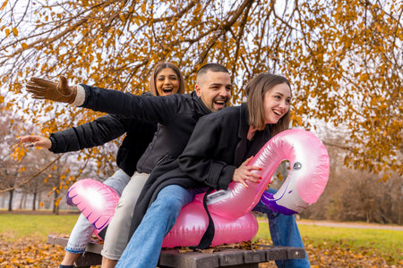 small group of young friends having fun riding an inflatable pink flamingo over a wooden table in a public park in winter