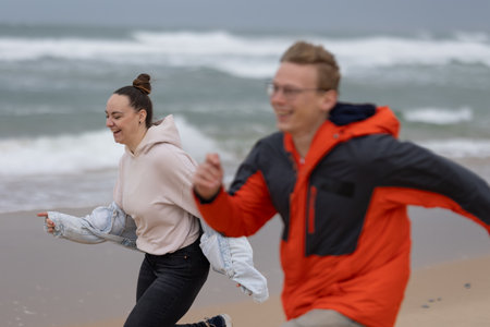 Cheerful couple in love running on the beach and enjoying their vacation