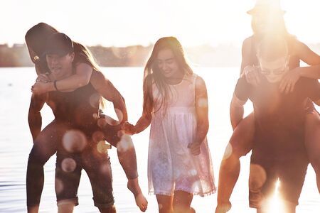 Happy friends have fun on the beach - Young people playing in open air water on summer holidays.