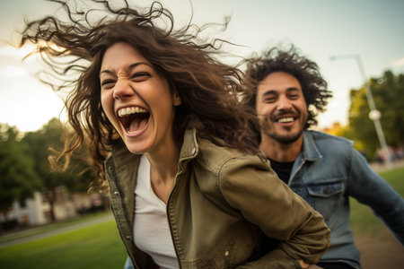 Two young adults enjoy a sunny day, sharing laughter as their wind-swept hair dances in the gentle breeze, embodying the joy of outdoor adventures and friendship.