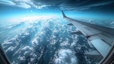 A mesmerizing view of an airplane wing soaring above a stunning cloudscape, seen from a passenger's window. Perfect for showcasing the awe of flight and sky travel. AI Generated.