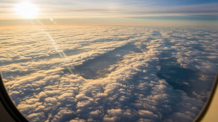 An aerial view through an airplane window, capturing the clouds and the horizon during a beautiful sunrise flight.