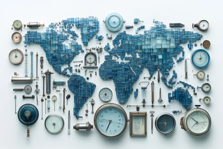 Artistic representation of a world map made from weather instruments highlights the importance of climate data.